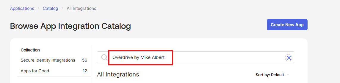 In Okta, Go to Applications → Browse App Catalog, and search and add Overdrive by Mike Albert